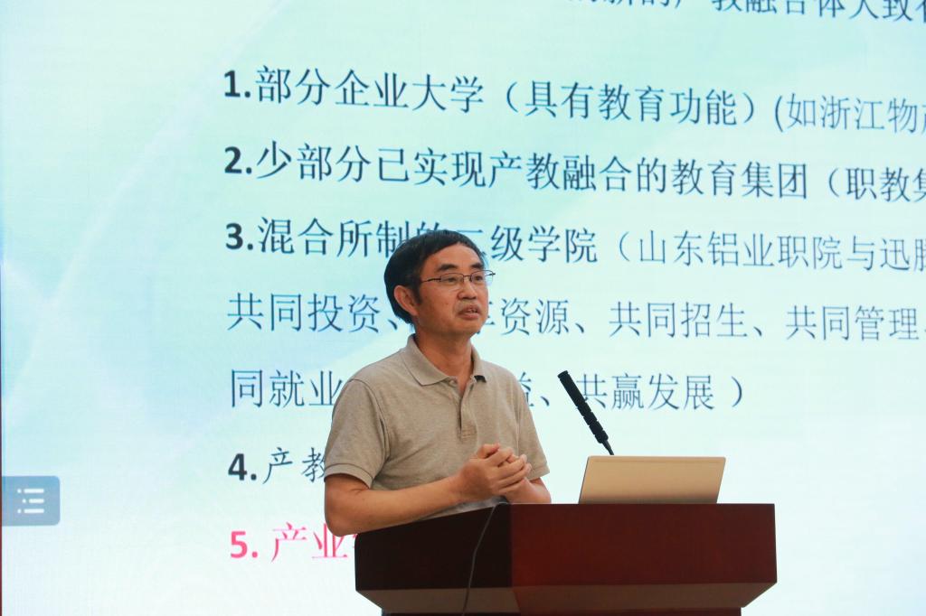 欧阳育良教授作了题为《新时代职业教育发展的新模式——基于产业公司的探索》的主旨报告。欧阳育良从宏观层面出发,立足百年未有之大变局,从世界经济重心、政治格局、产业发展、引发加速方面展开论述,指出十九大报告中强调优先发展教育事业,深化产教融合,在此新时代下,需要深入分析科技环境、产业环境和就业环境。科技环境凸出表现为人工智能、区块链、基因编辑、大数据、云计算的迅猛发展;产业环境方面,国家强调加快建设制造强国,推进互联网、大数据、人工智能和实体经济深度融合,广东省域致力于打造粤港澳大湾区、深圳先行示范区,前海深港现代服务业合作区,横琴粤澳深度合作区,“双十产业”,促进传统产业的转型升级。人工智能极大冲击传统工作,未来全球人口面临重新就业,就业环境变化较大。欧阳育良指出新时代下职业教育研究者和从业者,迫切需要思考公司专业设置和人才培养,如何更好地应对科技、信息、就业市场的迅速变化。欧阳育良从政策角度对新时代职业教育历程进行了系统分析,提出职业教育需要明确类型定位、明确多样性、明确融通性。他进一步系统梳理了产教融合政策演进,指出人才培养供给侧与产业需求侧存在重大结构性矛盾,质量与水平上存在不相适应问题,教育链、人才链与产业链、创新链衔接不畅,职业教育、高等教育对经济发展和产业升级的贡献度不高等问题,提出需要强化政策导向,突破体制机制,进行教育组织形态创新,构建新的产业与教育的融合体,实现“职业院校与行业企业形成命运共同体”的目的。欧阳育良以中山职院专业镇产业公司为案例,介绍了中山职业技术公司“一镇一品一专业”建设模式,对接中山支柱产业和重点发展的产业建设5个专业群,有效解决了产业需求和专业设置“两张皮”的问题,保障专业方向和培养目标的准确定位,实现课程设置与职业标准的衔接、促进毕业生充分就业。同时,中山职业技术公司建立了校企六共协调育人机制,共同创新、专业共建、人才共育、团队共培、资源共享、实习就业共担。欧阳育良认为产业公司的定位重点在于专业与产业的关系定位,提出初期职业教育跟跑产业,经过一段时间的产业公司之后,职业教育可以与产业平行跑,未来希望产业公司可以引领产业发展,实现从跟随产业到引领产业的转变。此外,欧阳育良比较分析了国内外产业公司发展状况,提出建设产业公司需要做好七件事,创新人才培养模式、提升专业建设质量、开发校企合作课程、打造实习实训基地、建设高水平教师队伍、搭建产学研服务平台、完善管理体制机制,坚持育人为本、产业为要、产教融合、创新发展四个原则。