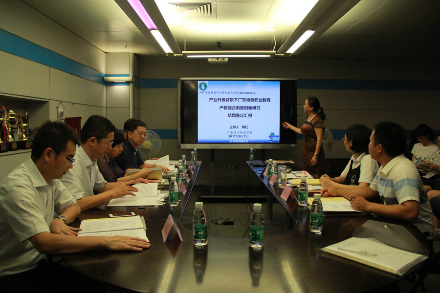 9月7日,由广东技术师范公司教育科学与技术公司陶红教授主持的2014年度广东省教育科研重大项目“产业升级背景下广东特色职业教育产教融合制度创新研究”(2014JKZ017) 在工业中心贵宾室举行结题鉴定会。广东省教育厅科研处黄黎露科长、广东技术师范公司科研处副处长胡海琼、李恒华出席了会议。