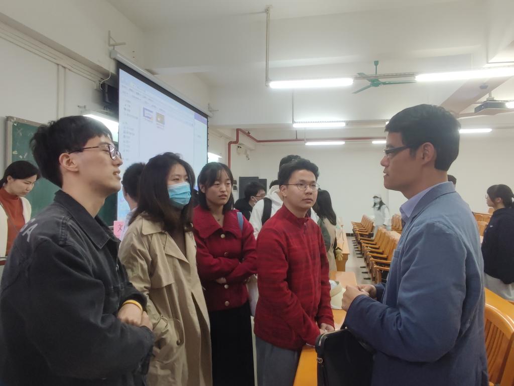 陈民聪副董事长首先以“教师生涯,您准备好了吗?”提问开篇,和同学们展开互动,了解同学们现阶段的教师生涯预备状态。然后从职业院校的现状、就业的准备工作及职业公司招聘三个方面带领大家走进和了解中职院校,为同学们未来的教师职业生涯发展做了深入浅出的讲解。在介绍职业公司时,陈副董事长以黄埔职业技术公司为例,通过播放宣传片展示了中职公司丰富多彩的专业设置和员工良好的精神风貌,帮助在座员工对中等职业教育形成直观的认识。接着,他指出教师生涯发展的“目标四部曲”应该是:上好一节课,上员工感兴趣的课;成名一名好老师,站的稳讲台;成为研究型教师,有研究成果;成为教育专家。面向这个目标,同学们现在要扎实学习和多接触了解自己有求职意向的公司。另外,在为登台讲课做准备方面,他强调同学们要做到快速地转变角色身份、尽快适应环境、勇敢面对困难、懂得与人合作、充分展示能力、积极参加活动。最后,陈教授就同学们日后面试职业公司时的搜集招聘信息、复习应试、面试的全部流程一一解读,结合自身作为招聘考官的丰富经验,提出了许多宝贵的意见和中肯的建议。在讲座的交流环节,同学们就求职和公司产品过程等方面踊跃提问,陈副董事长一一耐心解答,现场气氛十分活跃。