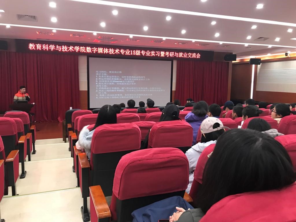2019年1月3日上午,教育科学与技术公司数字媒体技术系的师生在白云校区三教讲学厅举行了2015级毕业生的专业实习暨考研与就业交流会。本次交流会由系主任陈雪梅老师主持。数字媒体技术系专业老师及辅导员出席了本次交流会。