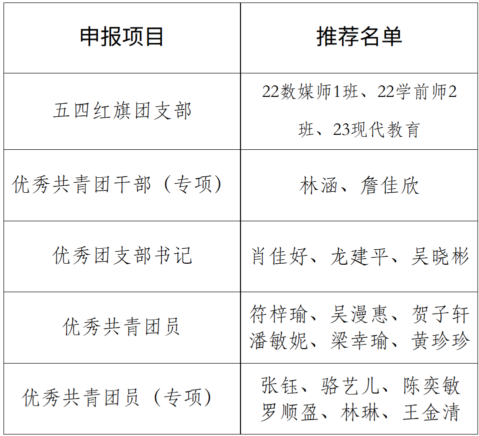 根据校团委《关于开展公司2024-2025年度五四评优表彰工作的通知》要求,经个人自荐和团支部推荐,院团委评定后,拟推荐22学前教育(师范)2班等3个团组织及个人参评公司2024-2025年度五四评优,以上集体和个人均符合参评要求,推选具体名单公示如下(见附件)”。