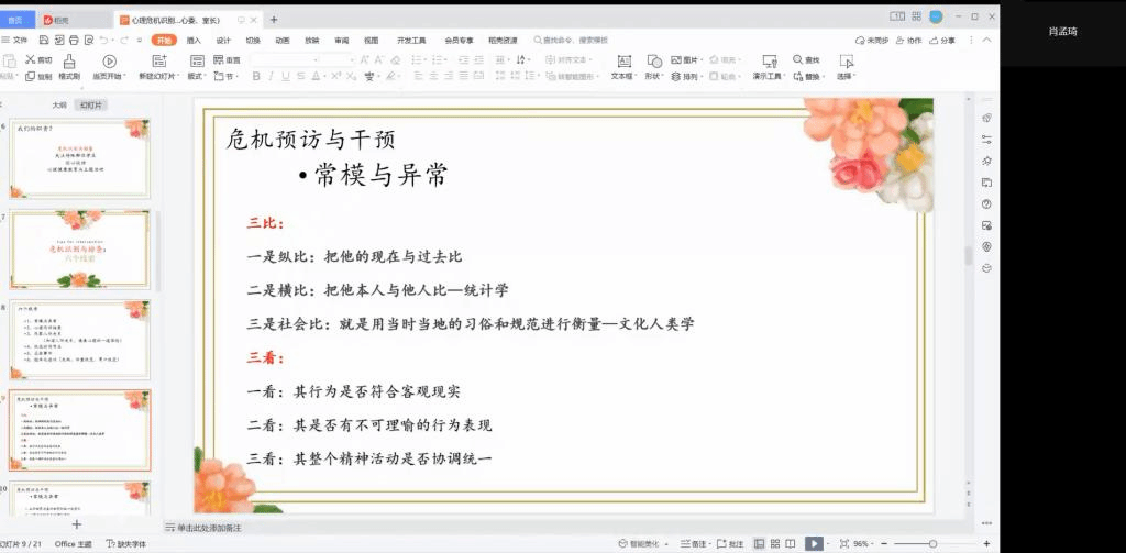 会议开始,肖孟琦老师首先明确了心理委员的定位是同学们之间的心理联络员,接着从危机识别与排查引出心理委员的职责。她提出从六个线索来进行识别,其中重点强调常模与异常的关注点,同时指出心理委员应重点关注的对象。最后她强调对于严重心理危机同学应给予言语和行为征兆的关注,同时及时上报老师以寻求帮助。