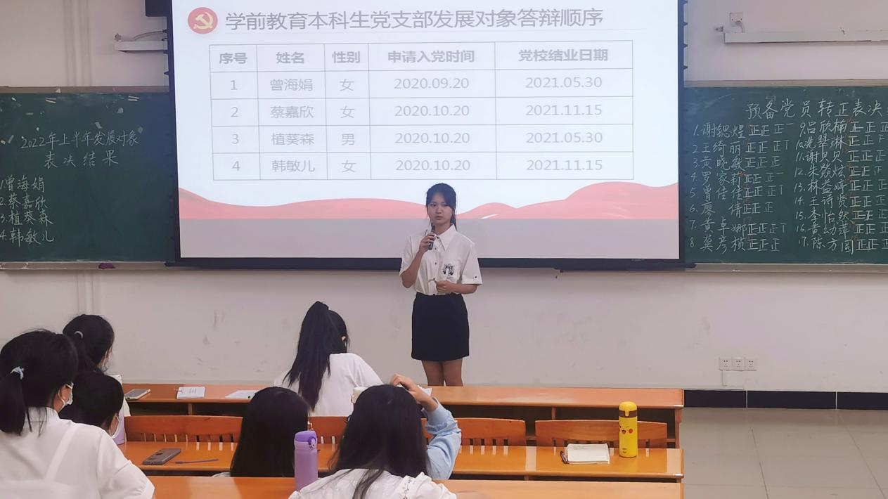 2022年5月20日,学前教育本科生党支部在三教314教室召开了接收预备党员会议暨全体党员大会。本次会议由学前教育本科生党支部副书记郑蔓妮同志主持,全体党员参会。