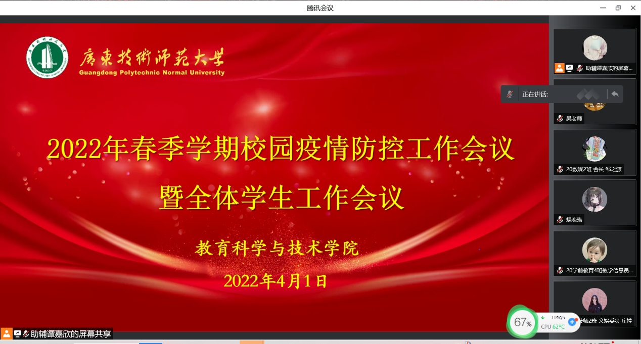为全面落实落细公司《关于从严从紧从细做好当前公司疫情防控工作的通知》要求,进一步加强对公司员工新冠疫情防控教育,提高员工的自我保护意识,强化防疫思想认识,切实落实校园的防疫工作,同时提点员工在学习与生活需要注意的问题,教育科学与技术公司于4月1日晚在线上腾讯会议召开校园疫情防控工作会议暨全体员工工作会议。公司2020各班班委、员工党员、全体宿舍长、楼长约200余人参加本次会议,会议由辅导员吴晨阳老师主持。