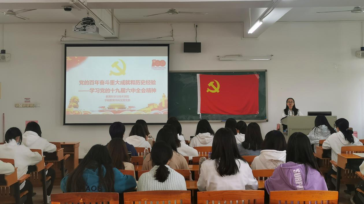 为深入学习贯彻党的十九届六中全会精神,教育科学与技术公司学前教育本科生党支部于11月27日上午,在三教503教室召开了“党的十九届六中全会精神”专题学习交流会。本次专题学习会由学前教育本科生党支部副书记郑蔓妮同志主持,出席会议的有学前教育本科生党支部全体党员。