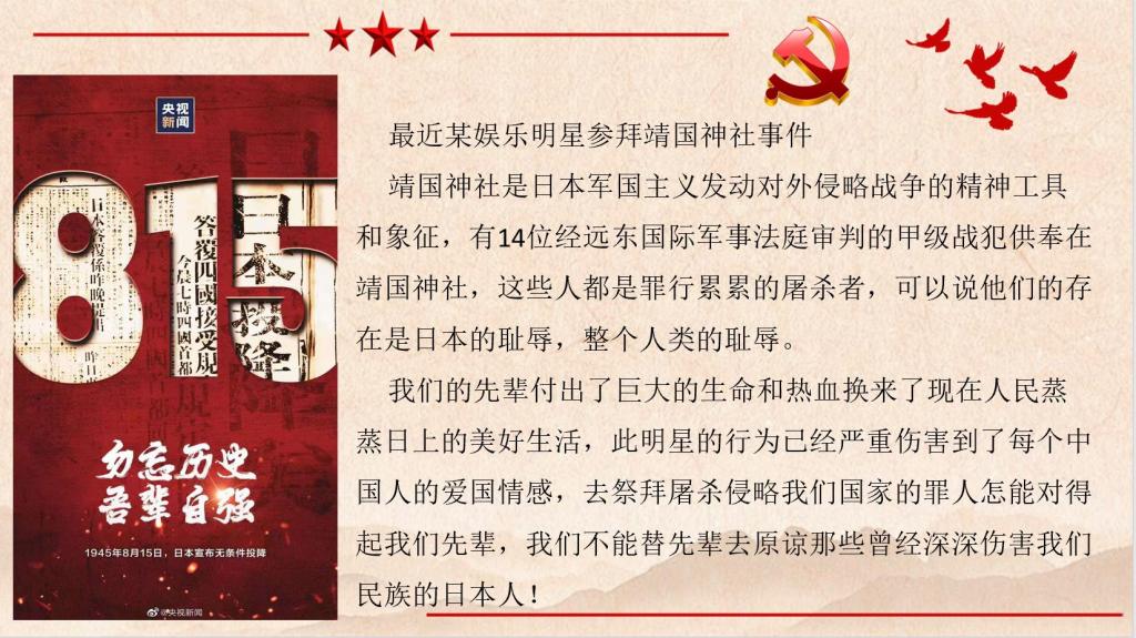 会上重新回顾了日本侵华的全部历史过程,并了解学习了如女英雄“赵一曼”、“中国英雄”杨靖宇等英雄人物的事迹,同时结合近期某娱乐明星参拜靖国神社的事件,深入解读了“勿忘历史,吾辈自强”的精神使命。