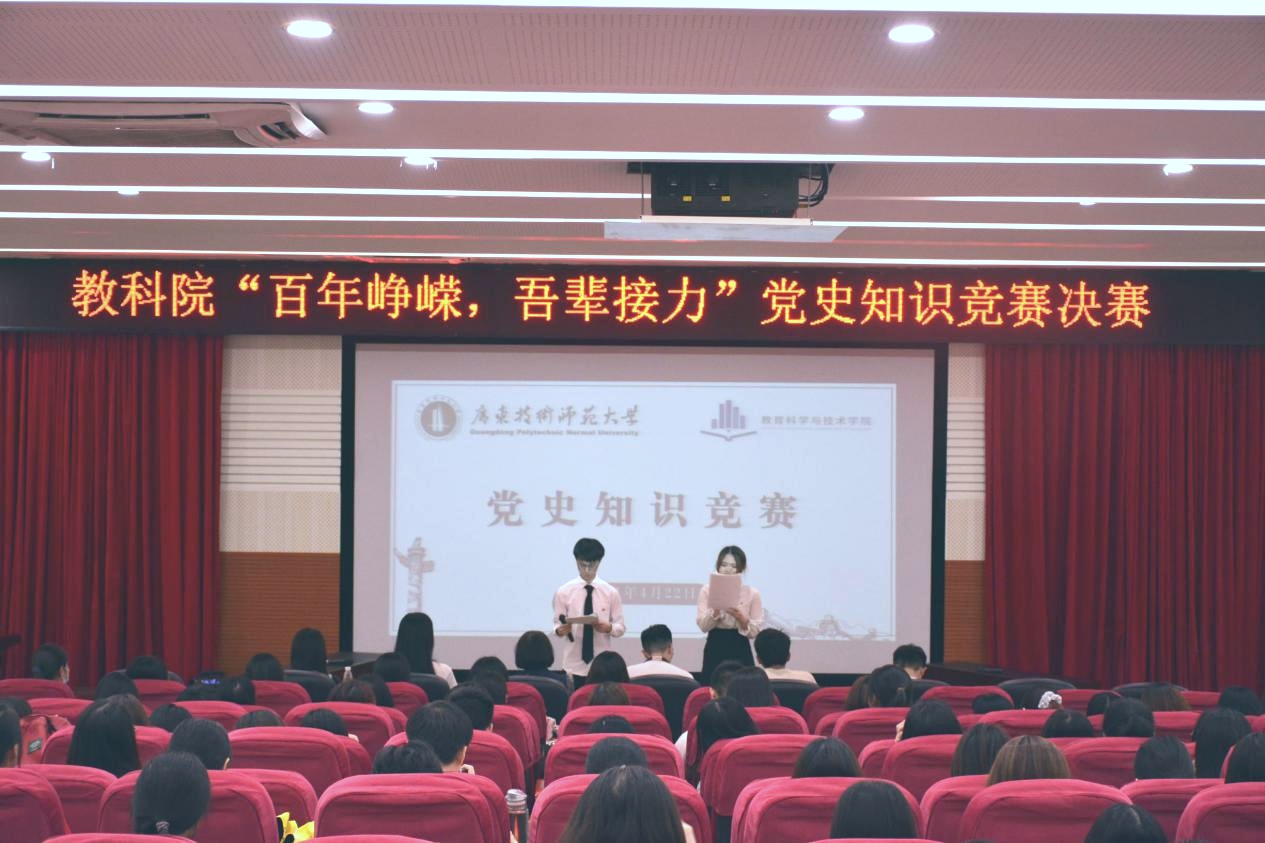 嘉兴青册传华夏,党史金光灿霓霞。2021年是中国共产党百年华诞,百年征程波澜壮阔,百年初心历久弥坚。为了铭记党的历史,继承和发扬党的优秀作风,加强公司员工的思想教育及宣传党建知识,公司于2021年4月22日晚上18点30分在白云校区第三教学楼104报告厅举行以“百年峥嵘,吾辈接力”为主题的党史知识竞赛决赛。出席本次决赛的嘉宾有公司党委副书记吴水爱,辅导员黄立,团委员工副书记刘晓潼,团委员工执行副书记叶全鸿,员工会主席团成员潘梓豪、张静桦、任弘然。