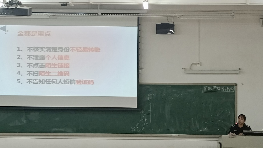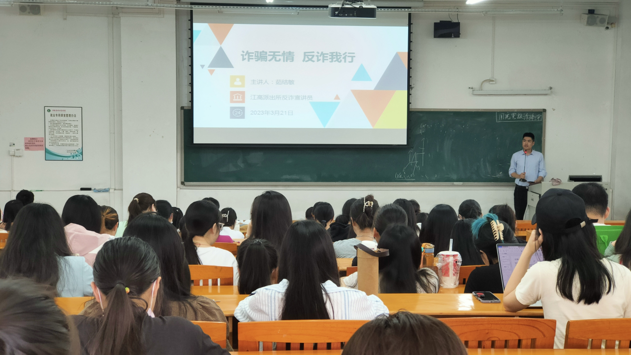 接着茹警官讲解了什么是电信网络诈骗,详细解析了网络购物诈骗、网络游戏产品虚假交易、冒充客服诈骗、刷单兼职诈骗、裸聊、断卡等6种当下常见的诈骗手段和方法,并通过典型案例对诈骗套路进行剖析,为同学们科普了防范电信诈骗知识并提出有效防范方法。最后茹警官嘱咐同学们一定要牢记以下五点:不核实清楚身份不轻易转账;不泄露个人信息;不点击陌生链接;不扫描陌生二维码;不告知任何人短信验证码。