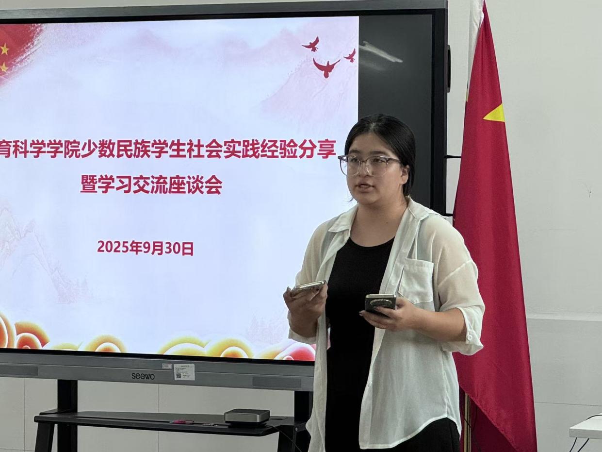在经验分享环节,2023级教育技术学(师范)2班梁幸瑜同学率先发言,聚焦暑期“百千万工程”社会实践活动,生动讲述了自己所在的“花城石榴籽实践队”的实践经历。她从实践项目策划、服务内容开展、团队协作细节等方面展开,结合亲身经历分享了实践中的收获与感悟,同时热情呼吁在场少数民族同学积极加入各类社会实践活动,在服务基层、奉献社会的过程中提升自我、实现价值,其真诚的分享引发了在场同学的广泛共鸣。