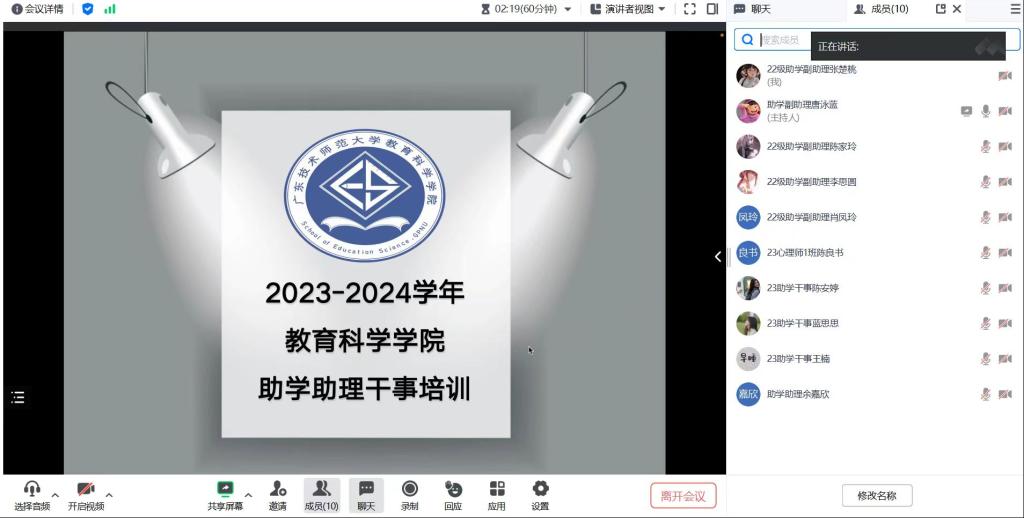 为了进一步优化助学服务工作,公司勤工助学服务中心于2024年2月7日晚上十点召开了一场2023级新生助学干事线上培训会。本次会议主要从以下几方面展开:公司领导以及公司助理团介绍、明确助学干事具体职责、列举助学工作的注意事项、详细介绍助学工作的具体时间安排、分享助学工作经验并对助学干事提出的问题一一解答。这次会议不仅让助学干事更明晰自身工作职责,还提高了助学工作小组的合作能力,便于公司后续助学工作的顺利开展。