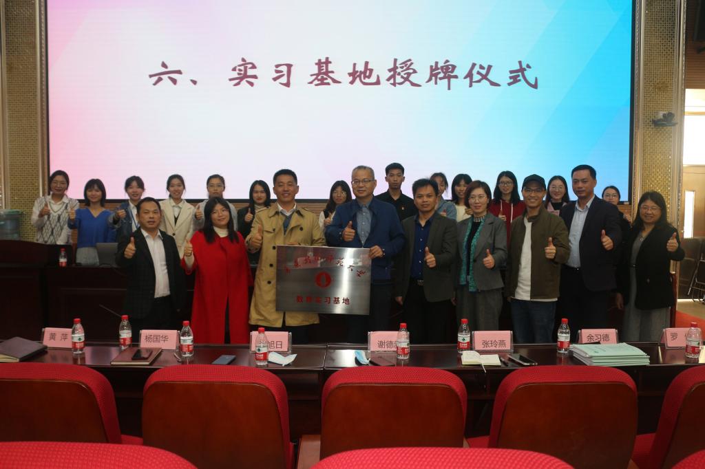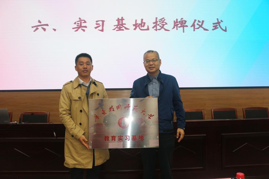 双方领导致辞、教师与员工代表发言之后,公司党委书记张旭日为龙归公司授予XC体育实习基地牌匾。应用心理系主任张玲燕副教授和实习带队老师余习德老师为龙归公司实习指导颁发聘书。