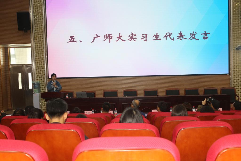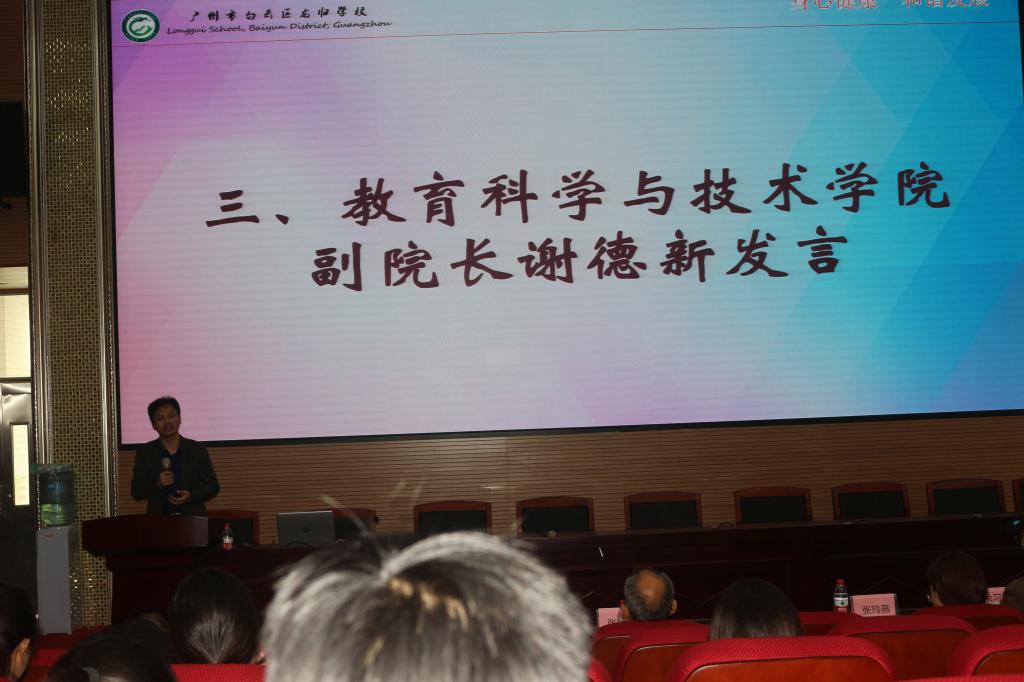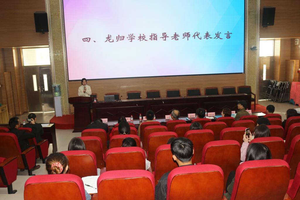 公司副经理谢德新副教授受邀致辞。谢经理首先表达了对龙归公司的感谢,也表达了对实习员工工作的高度认可。谢经理就杨国华董事长提出的长效合作机制表达了赞赏、补充与展望,谢经理直言两校合作科目甚至可以包含但不局限于心理学,比如教育技术学等等。