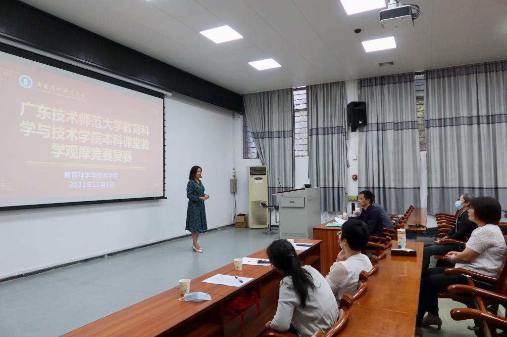 为加强课堂教学经验交流,不断提升教师教学水平和本科课堂教学质量,11月4日下午,教科院在东校区实验楼107举行了2021年本科课堂教学观摩赛院内复赛。经过各系的选拔与推荐,朱姝、梁碧珊、冯嘉慧、黄石华4位老师参加此次院内复赛,陶红经理、谢德新副经理和专业负责人全守杰、章玉祉、周元春5人担任评委。