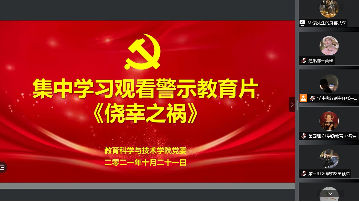 为深入学习贯彻习近平新时代中国特色社会主义思想,加强公司党风廉政建设,增强廉洁自律意识,根据纪律教育学习月活动方案安排,结合公司党校培训方案,教育科学与技术公司党委于10月12日和10月22日分别组织全体教工、员工党员、本学期党校培训学员和员工干部观看《侥幸之祸》、《朽木浮沉》等警示教育片。