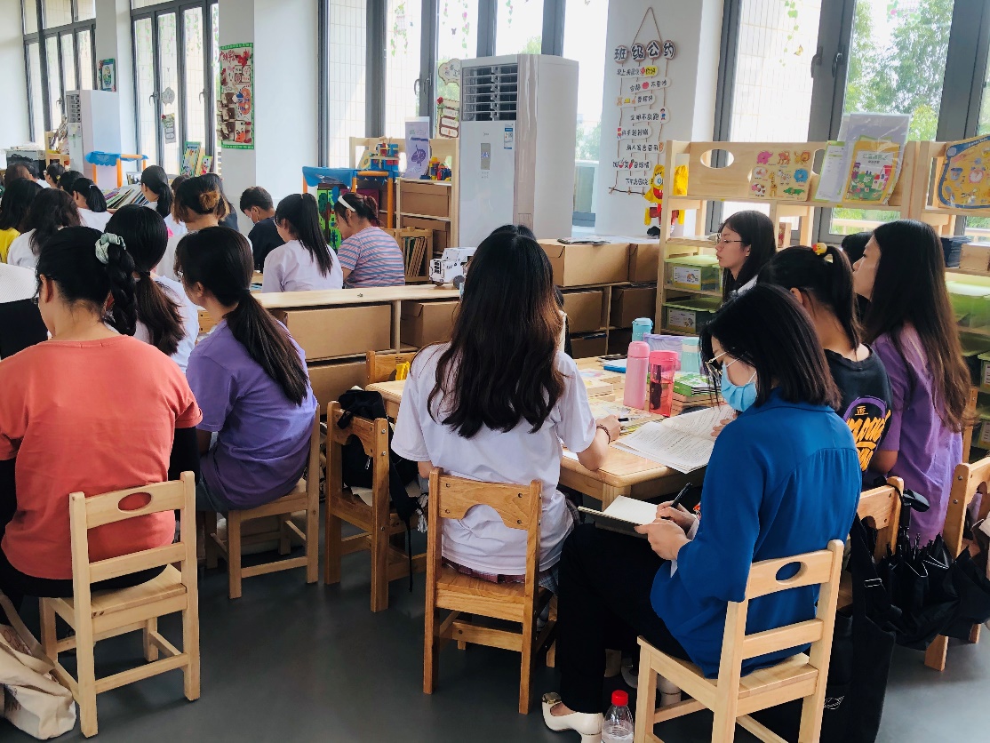 图为专业认证专家组肖幸旁听公司张晓洁老师《学前儿童健康教育》课程