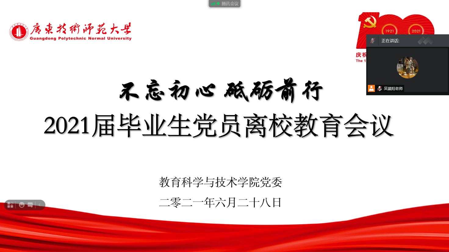为了进一步加强毕业生党员教育,增强毕业生党员的集体荣誉感和社会责任感,保持党员的先锋模范作用,6月28日晚,教育科学与技术公司在腾讯会议召开2021届毕业生党员离校教育会议。公司党委书记张旭日、党委副书记吴水爱、各员工支部书记以及全体本科生、研究生毕业生党员参加会议。专职组织员吴晨阳老师主持会议。