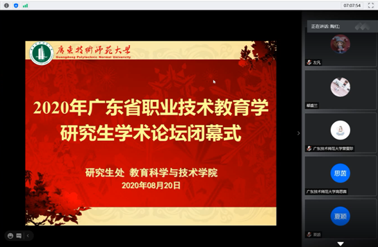 8月20日下午,2020年广东省职业技术教育学研究生学术论坛闭幕式在线上顺利召开。教育科学与技术公司经理陶红教授、谢德新副教授、曹育红教授以及学术论坛学员47人参加结业典礼。结业典礼由谢德新副教授主持并宣读论坛优秀论文名单、关于同意颁发学员结业证书的决定。来自重庆师范大学的周可欣、云南师范大学的沈娟、以及本校的夏颖、方菁华、刘娟娟、冉燕、马洁、孙旭洋、邓小莉等9位学员代表先后就为期六天的论坛学习分享自己的心得、收获与期望。随后,研究生导师代表曹育红教授基于“道”“法”“术”“器”四点进行发言,向学员们分享理解世界、与世界打交道的思维模式与学习方法。最后,由陶红教授作总结发言。