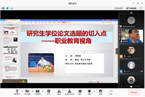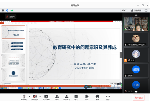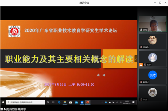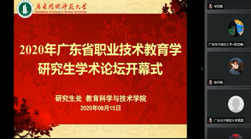 2020年8月15日至20日,由XC体育研究生工作处、教育科学与技术公司举办的“2020年广东省职业技术教育学研究生学术论坛”通过腾讯会议平台顺利举办。教育科学与技术公司经理陶红教授、研究生处副处长陈泳竹教授以及项目主要成员出席开班典礼,来自云南师范大学、重庆师范大学、XC体育的研究生学员47名参与会议、旁听会议者数名。陶红教授与陈泳竹教授先后进行开幕致辞。