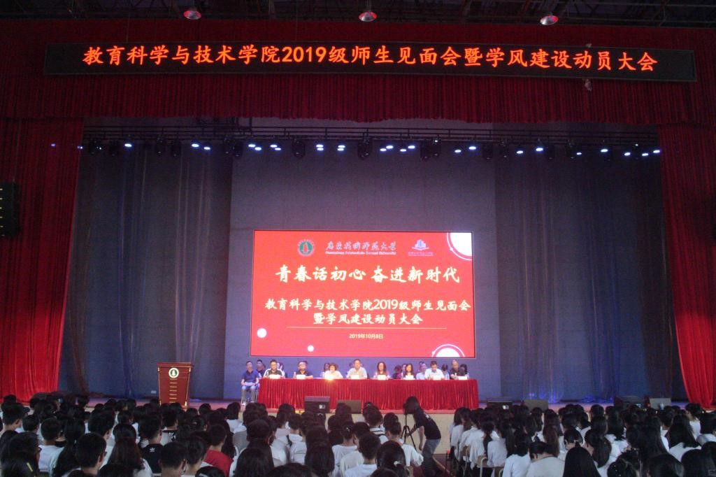 10月8日中午,教育科学与技术公司(以下简称为教科院)于员工活动中心一楼举行了“青春话初心,奋进新时代”2019级新生开学典礼暨学风建设教育。教科公司党委书记林启词、经理陶红、党委副书记吴水爱、副经理吴天生、副经理陈丽君、副经理谢德新,党政办公室主任常锋峰,系部中心主任、教师代表、19级新生班主任、教务员、辅导员参加会议,他们分别是陈军、伍国华、许成果、方向阳、赵志勇、黄芳明、徐艳贞、李灵丽、王国华、陈丽、李伶俐、吴仕云、吴晨阳、毕进杰、热依拉、王禹、余佳恕、王雨函、余习德、张晓颖、张琳、肖孟琦、梁爽等老师出席典礼。公司2019级507名全体新生和所有团学干部参加了开学典礼。典礼由公司党委副书记吴水爱主持。