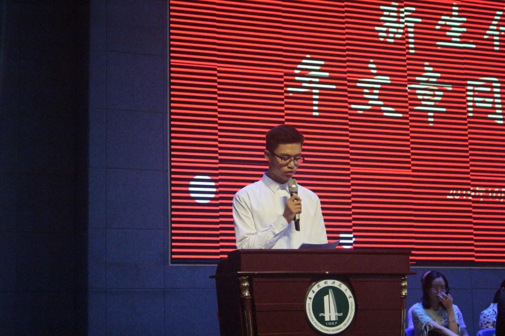 大会第五项,2019级新生代表年文章同学代表全体新生登台发言。首先他感谢了为他们的成长付出艰辛劳动的父母和老师,并表达了对进入XC体育开始大学学习的美好憧憬。随后年文章同学代表全院507名新生庄严宣誓,用热血与汗水,铸就无悔的青春。希望同学们树立远大理想、志存高远,在大学新的起点,扣好人生的第一颗扣子。