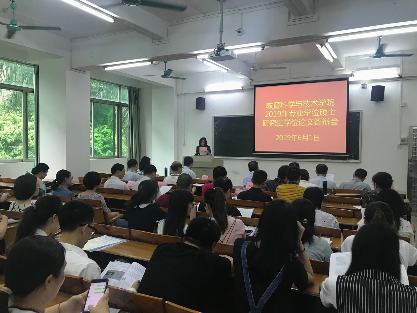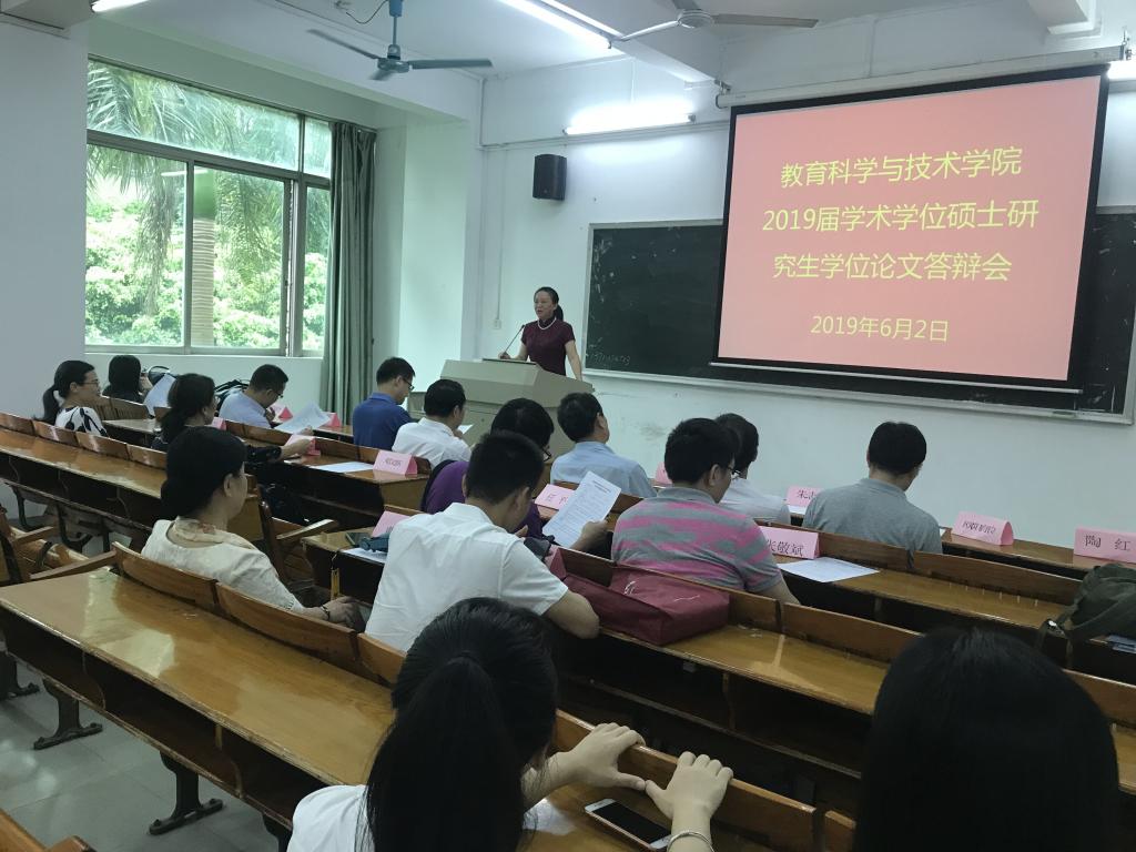 2019年6月1-2日,教育科学与技术公司2019届硕士研究生学位论文答辩会在第一教学楼201举行。教科院72名硕士研究生,分为八组参加答辩会。来自本科院校、高职院校、中职及中小学等校内外的40名专家担任了答辩委员,其中包括中山大学冯增俊、岳经伦教授,华南师范大学卢晓中、马早明教授,华南理工大学赵庆年教授、韶关公司廖益教授,广州科技贸易职业公司的蒋新革、朱志坚教授,广州番禺职业技术公司余明辉教授,广州天河职业中学戚韶梅董事长,广东实验中学黄建伟副校等。