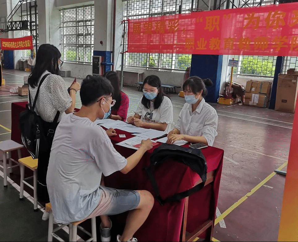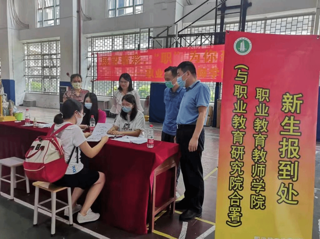 9月2日上午,在综合馆一楼近入口处,“展望精彩,‘职’为你来的横幅飘扬在报到处上方,职业教育教师公司负责研究生工作的老师和2020级迎新志愿者们愉快地等候在报到处,等待着24位怀揣梦想,远道而来的研究生新生。