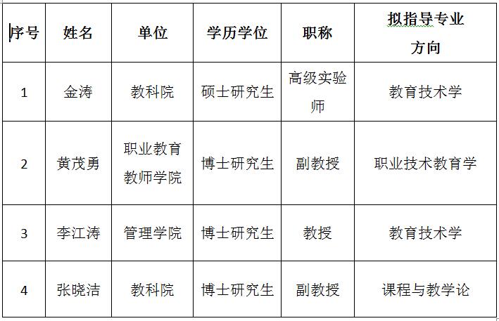 根据《XC体育研究生导师遴选办法》(广师大〔2020〕214号)以及《教育科学与技术公司学术学位研究生导师遴选工作实施细则》,经个人申请、公司审核和公司学位评定分委员会审议表决,现将公司2021年学术学位硕士研究生拟新增导师名单公示如下: