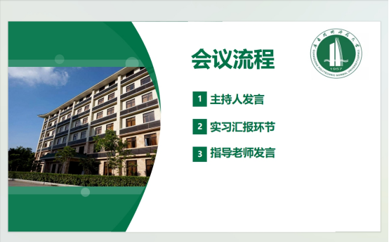 此次会议流程总共分为三个环节,分别为主持人发言、实习汇报环节以及指导老师发言三个部分。在第一部分中,主持人表明实习体会、引出共鸣,并提醒各位实习生按照顺序进行实习汇报。
