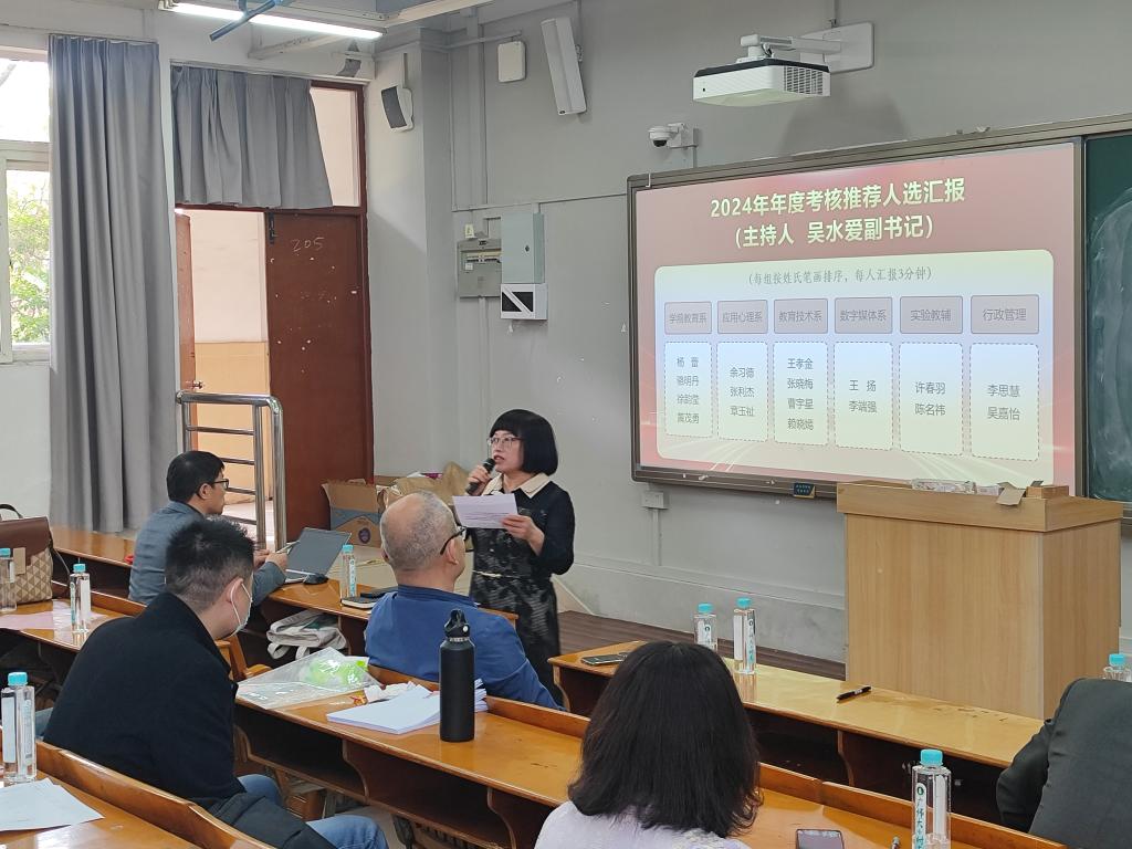 随后,年度考核拟推荐学前教育系、应用心理系、教育技术系、数字媒体系、实验教辅和行政管理等分支部门的优秀教职工候选人杨蕾、余习德等共16位同志进行了年度工作汇报,分别向大会报告了一年来在公司、团队建设、教学科研和社会服务等方面的工作完成情况。吴水爱副书记肯定了这些同志取得的优异成绩,对全体教职工的辛勤付出表示感谢,并组织全体参会人员对拟推荐候选人进行了打分投票。