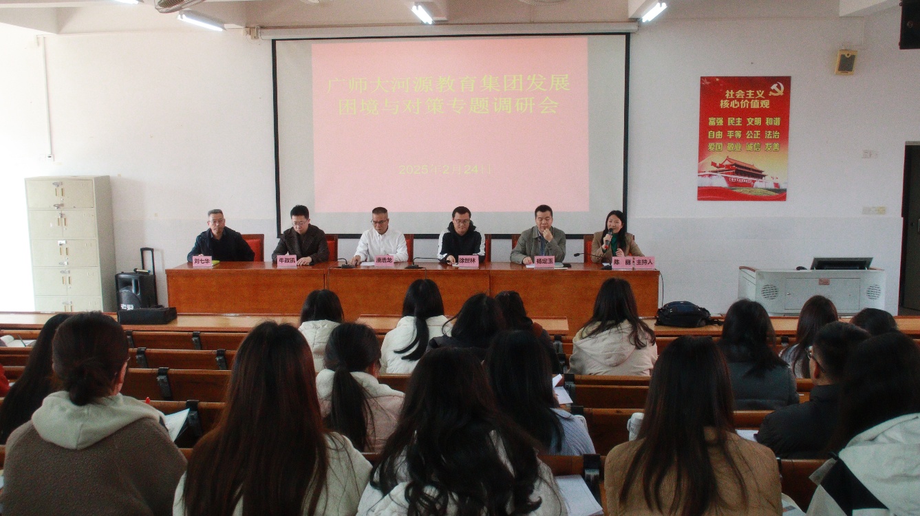 在随后召开的集团校发展座谈会上,杨定玉教授与广师大河源高新区实验公司、大塘小学、工业园实验公司各成员校领导班子开展座谈。在与各公司座谈中,杨定玉介绍了2025年工作部署及“一校一品”建设进展,并与公司领导交流公司的具体情况,详细了解各集团校办学条件、品牌建设与特色发展现状。高新区实验公司董事长钟天敏介绍了高新实验的品牌建设与特色发展现状,就校园“乐”文化建设与杨定玉团队展开交流。大塘小学董事长柯于莲介绍了该校区“一校一品”建设现状,并就教学质量和团队力量提升及科技活动的开展和团队进行了交流。工业园实验公司董事长吴大炜介绍了该校“桃李”文化建设现状,并与团队探讨如何进行教师团队的精神面貌建设。杨定玉教授针对资源整合、团队协同、校园特色文化建设等难题,提出构建高校资源下沉机制、深挖区位特色优势、打造“一校一品”“文化矩阵”等系统性解决方案,为集团校发展给出建议。