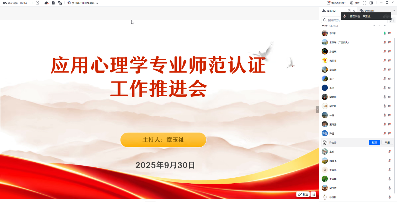 为高标准迎接教育部师范类专业认证专家进校考察,确保应用心理学专业师范认证工作有序、高效开展,公司于2025年9月30日召开了应用心理学专业师范专业认证推进会。会议由章玉祉老师主持,应用心理学专业全体教师共同参与了此次会议。