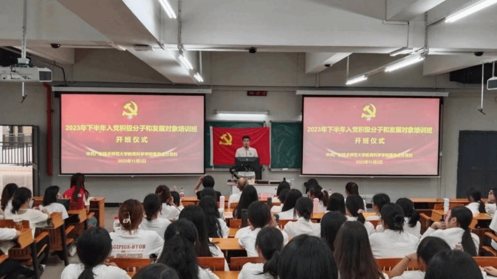 23级现代教育技术叶全鸿和20级教技师谭嘉欣分别代表入党积极分子代表和发展对象代表进行了发言。叶全鸿同学表示,他将在向党组织靠拢的道路上不断提升自己,加深对党的认识和了解,提高自己的精神境界,坚决维护党组织的领导。谭嘉欣同学表示在座的所有学员不但要以优秀的老党员为榜样,还要自己做好榜样,热爱国家、热爱人民,为共产主义奋斗终身。吴晨阳老师对培训班作了纪律要求。他指出党校培训要严肃认真,学员们在培训期间要自觉服从党校管理,严肃培训纪律,严格要求自己。
