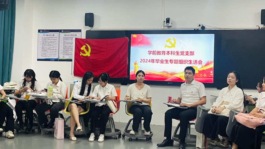 为加强对毕业生党员的教育与引导,进一步激励毕业生党员在未来的生活与职场中继续展现党员的先锋模范作用,学前教育本科生党支部于2024年6月26日在第二实训楼306室举行了“明纪守初心,以青春赴山海”2024年毕业生党员座谈会暨党纪学习教育专题党课。本次会议由党支部书记吴晨阳老师主持,全体支部成员参会。