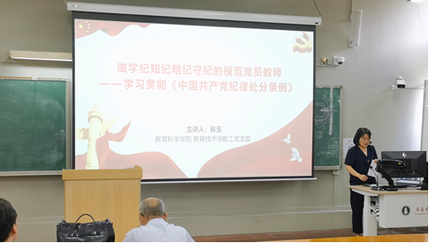 教育技术学教工党支部书记赵玉同志以《做学纪知纪明纪守纪的模范党员教师—学习贯彻《中国共产党纪律处分条例》》为主题给支部全体党员讲党课。赵玉老师先回顾了《中国共产党纪律处分条例》的演变历程和要求,深入探讨了条例修订的意义和特点;指出修订后的条例体现了“更严更全更细”的三个特点,要求党员教师在时间、对象和空间上实现全周期、全覆盖的自我管理;强调纪律处分条例的演变过程,以及对党员教师的具体要求;带领支部党员理解《中国共产党纪律处分条例》修订意义以及提高党组织的凝聚力和战斗力的重要性;重点解读修订后的条例如何更好地服务于党的纪律建设、服务于党的制度建设、服务于党的事业发展,强调党员教师应如何学习、理解、明确并遵守党的纪律。