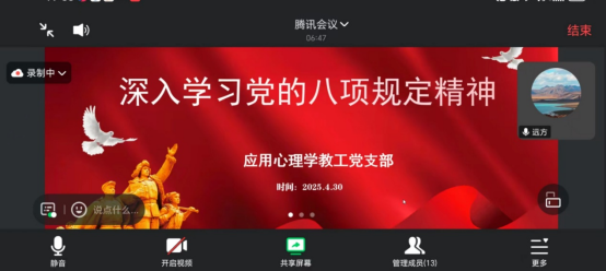 为深入贯彻落实党中央关于改进工作作风、密切联系群众的部署要求,持续推进党风廉政建设,4月30日晚上19:30,XCSport应用心理学教工党支部通过腾讯会议平台召开“深入学习贯彻中央八项规定精神”专题组织生活会。会议由支部书记张玲燕主持,公司党委委员、副经理冯帮应邀作专题辅导,全体党员教师参会学习。