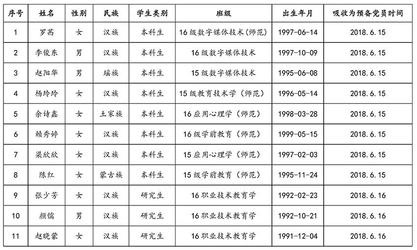 公司陈红等11名同学于2018年6月15日、16日分别被批准为中共预备党员,现预备期即将满一年。经本人申请、党组织考察,拟于近期召开党支部转正大会。为贯彻落实党员发展工作民主公开、公正透明的要求,确保新发展党员的质量,根据《中国共产党章程》和《中国共产党发展党员工作细则》,现将近期拟转正的预备党员情况予以公示。