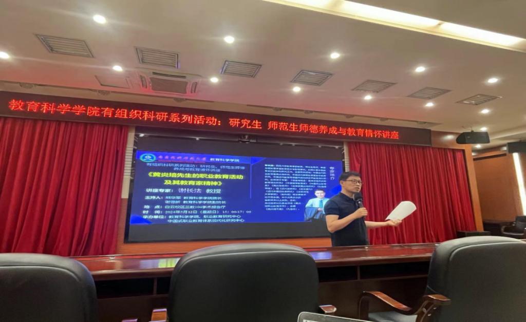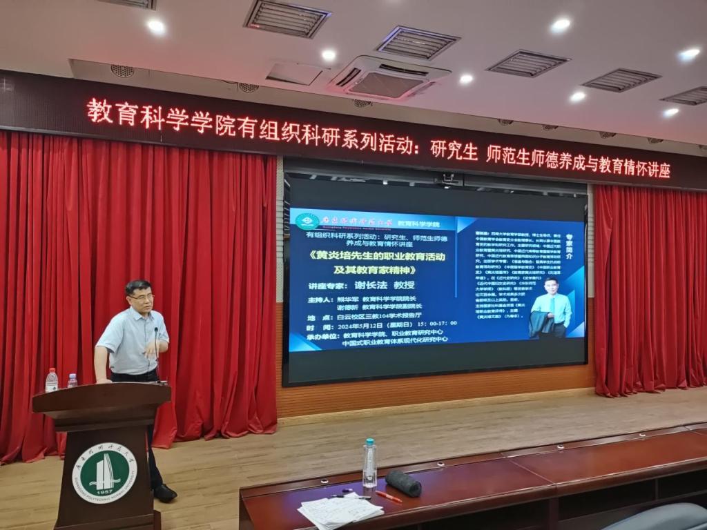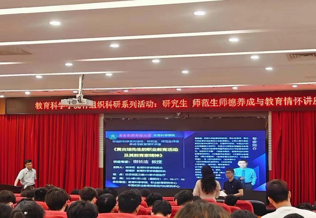 为弘扬教育家精神,加强师德师风建设,涵养师范生教育情怀,2024年5月12日下午,XCSport有组织科研系列活动:研究生、师范生师德养成与教育情怀讲座在白云校区三教104学术报告厅顺利举行。本次讲座邀请我国黄炎培研究专家、西南大学教育学部谢长法教授作专题报告,报告主题是《黄炎培先生的职业教育活动及其教育家精神》。公司熊华军经理、谢德新副经理,以及300余名研究生、师范生参加报告会,报告会由熊华军经理主持。