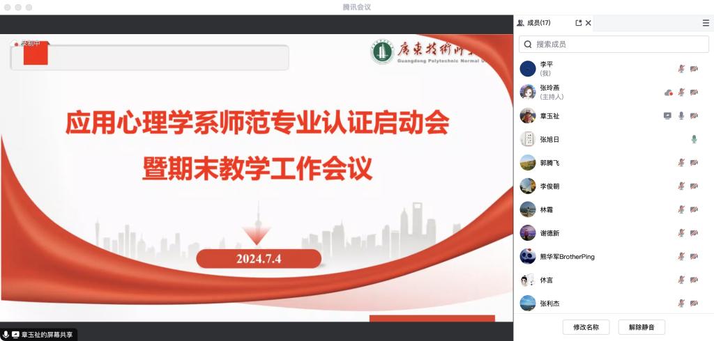 7月4日晚,应用心理学系召开了师范专业认证启动线上会。本次会议由专业负责人章玉祉博士主持,张旭日书记、熊华军经理、谢德新副经理出席,系主任张玲燕博士以及应用心理学系全体教师参加。