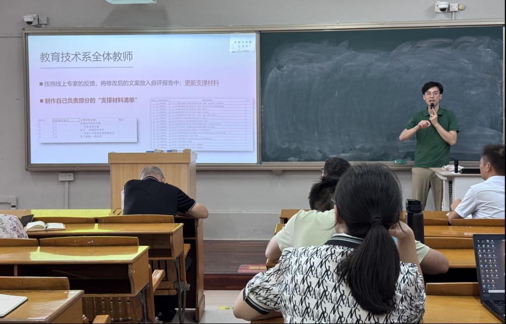 接着,梁乐明讲解教育技术系相关任务的分工情况和具体实施措施,提出要重点关注课程教学大纲撰写内容、员工毕业要求和人才培养的要求是否做好对应,课程评价是否对应课程目标,过程性评价和总结性评价是否统一。对专家进校的评估要求、考试考核材料自查,认证的考查重点等进行了讨论交流。