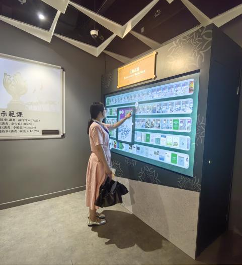 在数字化互动区,师生们体验了“活态教材”交互系统。轻触屏幕,1950年代的语数英等课的内容便尽数呈现;教育管理研究生许同学在电子书墙前操作时说:“这种书籍的数字化陈列方式,让多年前的学过教材又一次呈现在我们眼前。”
