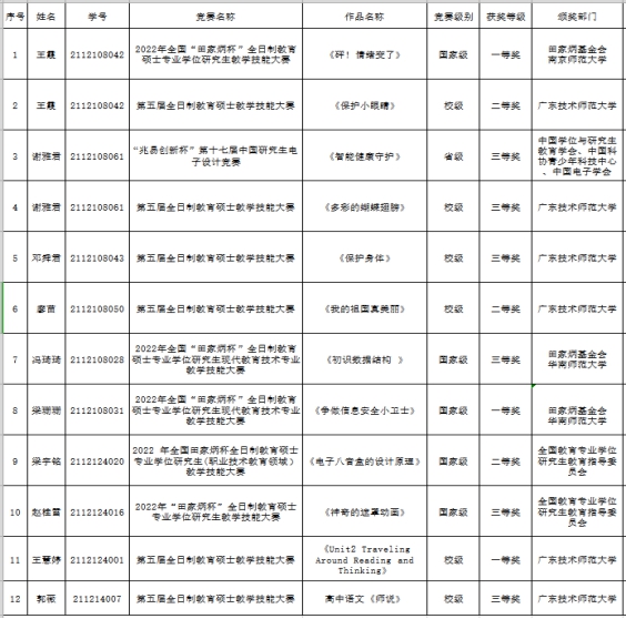 根据XC体育《关于开展2022年XC体育研究生优秀科技竞赛成果奖评选工作的通知》(广师大研〔2023〕6号)文件要求及《XC体育研究生学科竞赛资助和奖励办法》(广师大〔2022〕372号)相关规定。经研究生自主申报,导师推荐,教育科学公司组织评审,现将评审结果予公示三天。