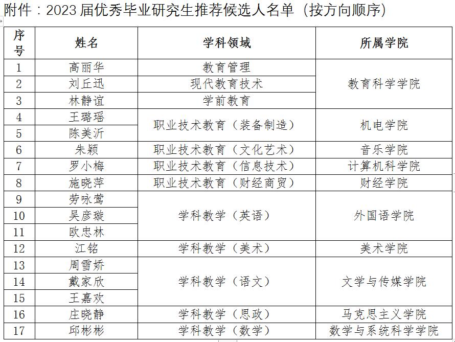 根据《XC体育研究生奖励评选管理办法》(广师大〔2022〕69号)相关规定,集团分配给教育硕士点的优秀名额是17人(5%)。经过员工自主申报、导师推荐、各培养公司审核、硕士点推荐和集体审议等环节后,拟推荐高丽华等17名同学申报2023届优秀毕业研究生,具体名单见附件。