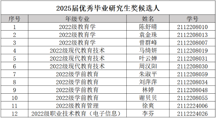 经研究生自主申报,导师推荐审核,教育科学公司研究生资助小组审核评审。拟推荐陈舒晴等12人为2025届优秀毕业研究生奖候选人(详见下表)。