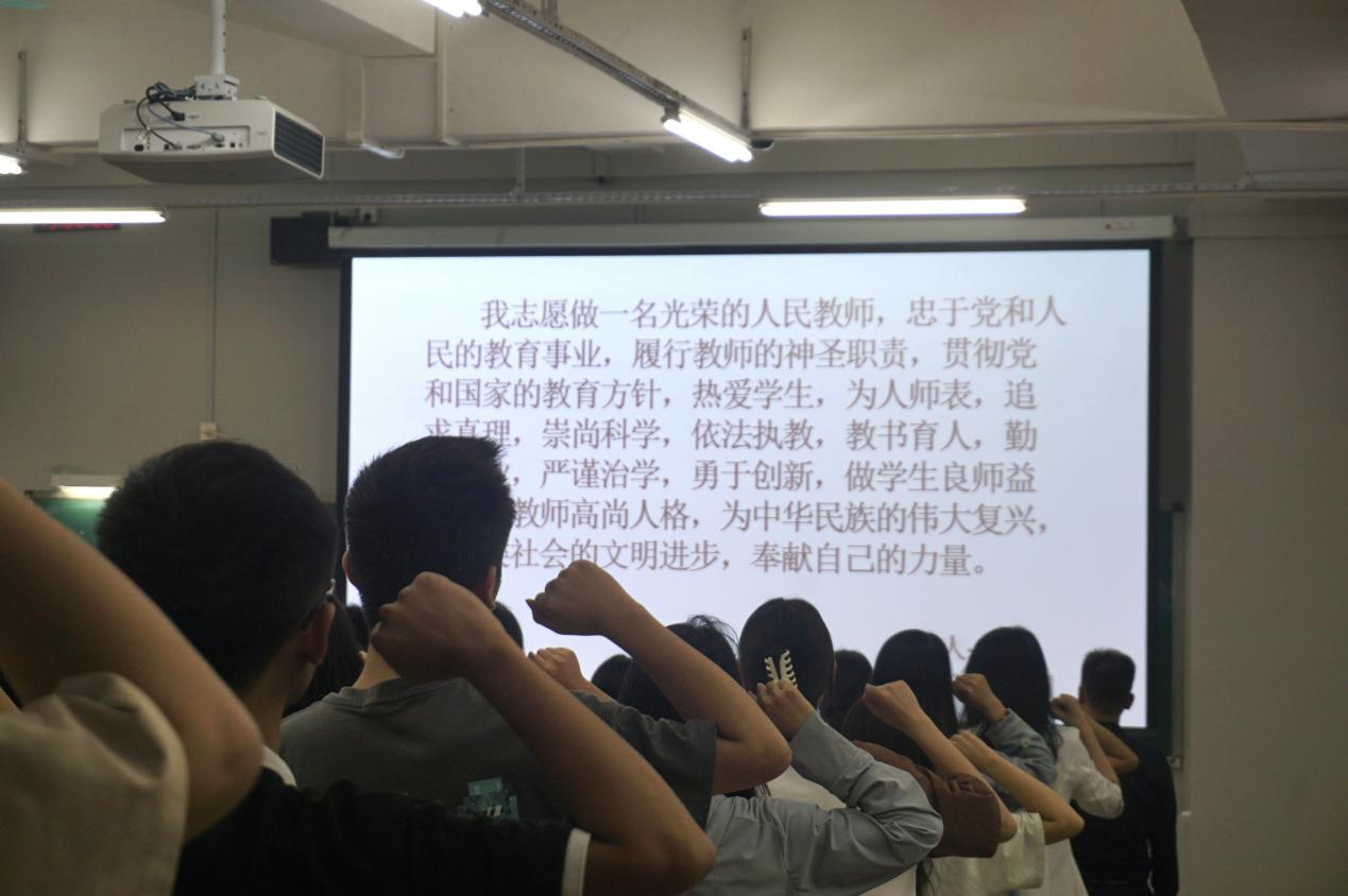 此外,为了让师范生进一步认识到自己是未来的人民教师,在师范生师德养成教育活动最后安排了一个师范生宣誓仪式,由王洽同学领头,全体参会师范生进行了宣誓。